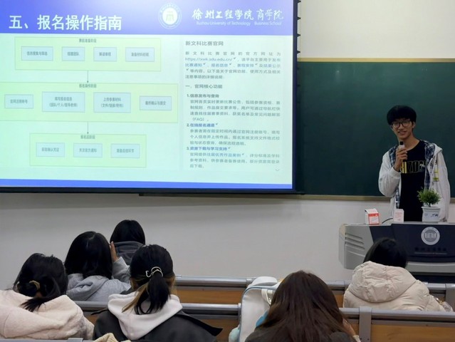 本次讲座的主题为“文科潮玩·创出新意——新文科创业赛事指南”,由bv伟德科创实践部副部长魏巍主讲。主讲人首先就新文科比赛的赛事定位展开讲解,明确了其作为面向文科老员工推动文科教育与社会实践深度融合,实现文科“软实力”向发展“硬支撑”转化的重要意义。随后,主讲人按学科分类进行规范化指导,就文史哲赛道、经管法赛道、教育类赛道、艺术类赛道主要内容分别进行详细阐述,为不同专业学子选择精准赛道提供参考。主讲人通过“时间轴+流程图”的可视化方式,清晰梳理新文科赛事节奏,详细拆解“项目筹备-报名提交-初赛比拼-决赛冲刺”全环节,明确团队组建、商业计划书撰写等环节应对注意的问题。主讲人还就选题技巧,材料准备、成果呈现、跨学科协作等方面注意的问题进行了详细讲解。主讲人针对跨公司组队、项目开展、参赛报告与商业计划书差异等实操问题进行答疑,引导学子充分利用官方资源,提升备赛针对性。