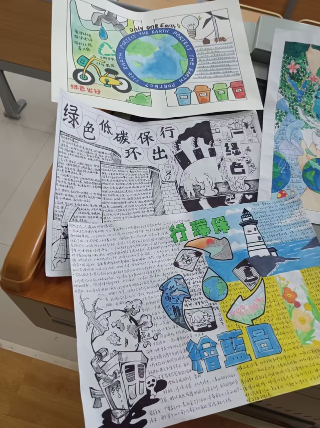 本次活动中,同学们拿起画笔,发挥创意,绘制出了一幅幅色彩丰富、立意鲜明的手抄报和电子海报。在同学们创作的作品中,有的流露出对环境恶化的担忧;有的呼吁人们停止对环境的伤害;有的则抒发了对绿色生活的向往。每幅作品紧紧围绕保护环境主题,内容充实,文体鲜明,图文并茂,生动而具有意义,将自己对“环保”、“绿色”、“低碳”的认识和体会通过手抄报和电子海报的形式展现地淋漓尽致。一幅幅用心的作品、一句句发自肺腑地呼吁,真诚地表达出了呼唤环境保护、渴望绿色家园的心声,通过色彩与文字的交汇,呼吁大家积极地参与到保护环境的行动中。