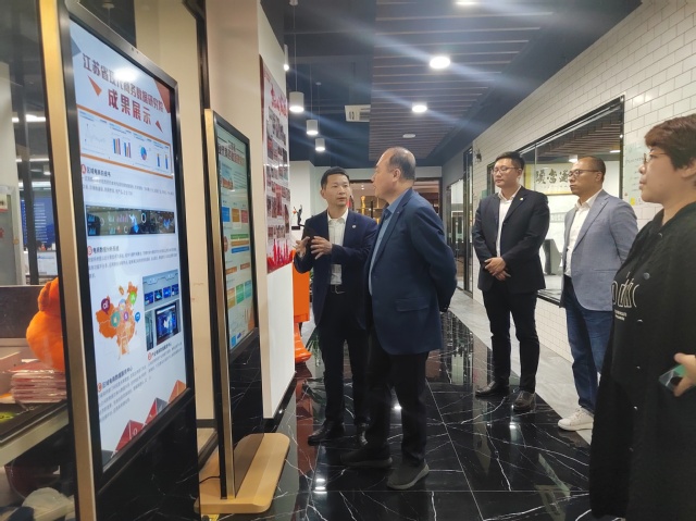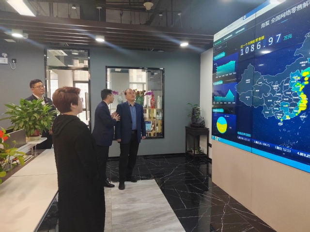 王经理一行到达企业后,企业负责人带领公司一行参观了淘金集团公司展厅,深入讲解集团发展概况,所获各项荣誉、现代商务数据研究院成果、特色党团支部建设成效、农产品平台供应链建设成绩等。王经理驻足“全国农产品网络零售数据”大屏前,随机调取不同农产品近三个月内交易量,真实体验大数据背景下农产品电商运营相关情况。