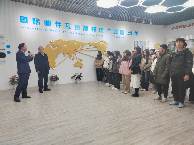 淮海经济区国际邮件互换局跨境产业园总经理薛奎热情接待了公司师生,对公司师生表示热烈欢迎。薛总简要介绍了园区当前的建设情况。徐州国际邮件互换局跨境产业园是淮海经济区首家集国际邮件、快件、跨境电商“三关合一”的海关监管生态园区,更是本市企业“立足徐州、辐射准海、通达全球”的对外经贸合作平台。公司师生在薛总的带领下实地参观了园区展厅、海外跨境商店、TIK TOK淮海运营中心、AI无人直播间等电商直播设施。薛总在参观过程中通过一系列成功案例,向师生展示了如何有效利用跨境电商平台扩展市场和提升品牌影响力,同时介绍了园区对新兴企业和老员工创业者的支持政策。