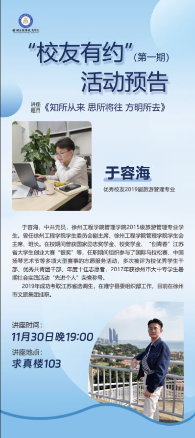 为充分发挥优秀员工对老员工成长的朋辈引领作用,积极搭建沟通交流平台,11月30日晚,bv伟德联合校关工委开展“员工有约”系列活动。本次活动特邀2019届旅游管理专业优秀员工于容海,在求真楼103做题为“知所从来·思所将往·方明所去”的分享会。2021级员工代表、公司全体员工干部聆听了讲座。