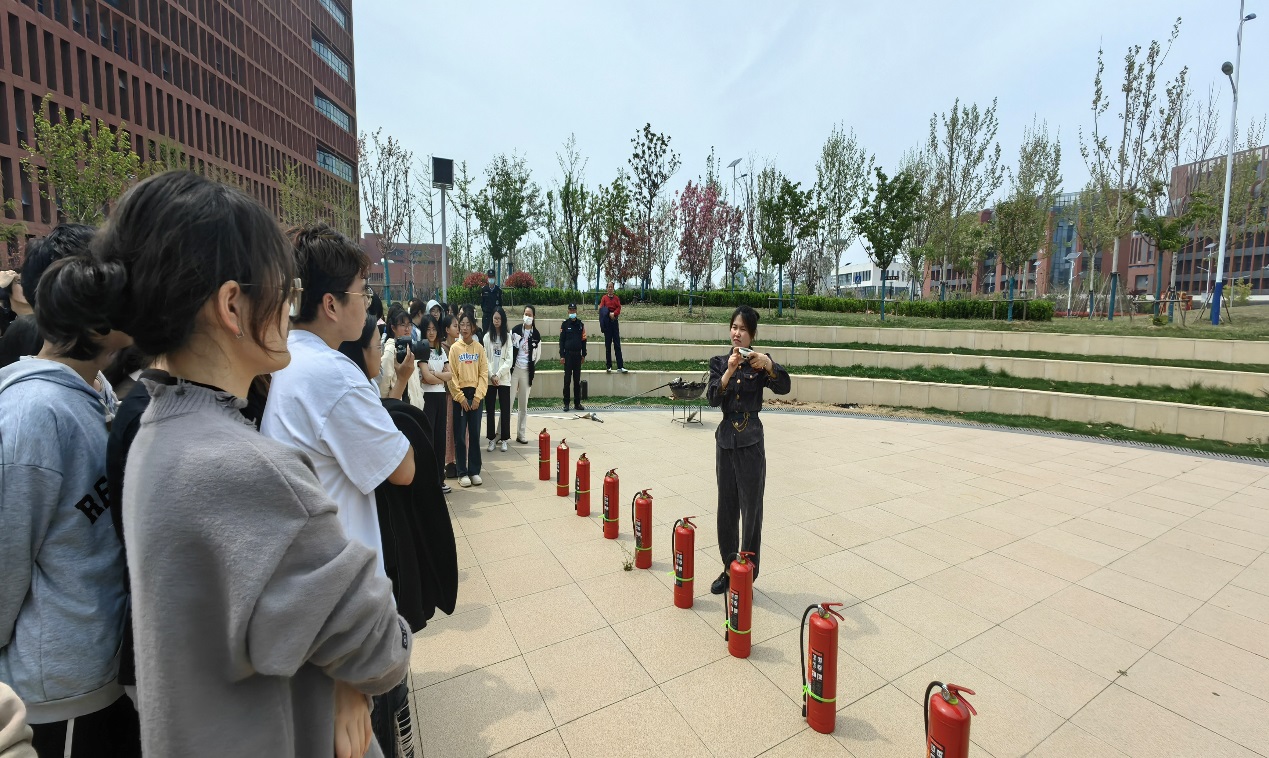 活动开始后,保卫处老师首先向同学们讲授了校园消防相关理论知识,介绍了校园里几类常见的灭火器械——灭火器、消防栓、烟雾报警器和消防带等,比较了不同灭火器械的特点及其适用场景,提醒同学们在火灾初起阶段及时拨打119报警,正确使用消防设备。随后,保卫处老师讲述了干粉灭火器和消防栓的使用方法和操作步骤。老师精彩的讲述引起了现场同学们的浓厚兴趣。同学们两两一组,兴致昂扬地参与到实践演练中去。在老师的指导下,现场同学们体验使用灭火器灭火,尝试握紧消火栓,瞄准前方燃火点喷水操作。活动现场氛围热烈。整个演练活动持续将近四十分钟。