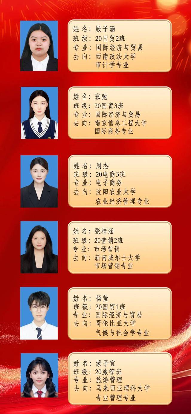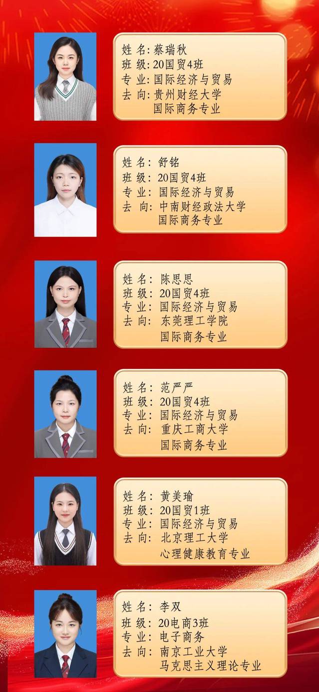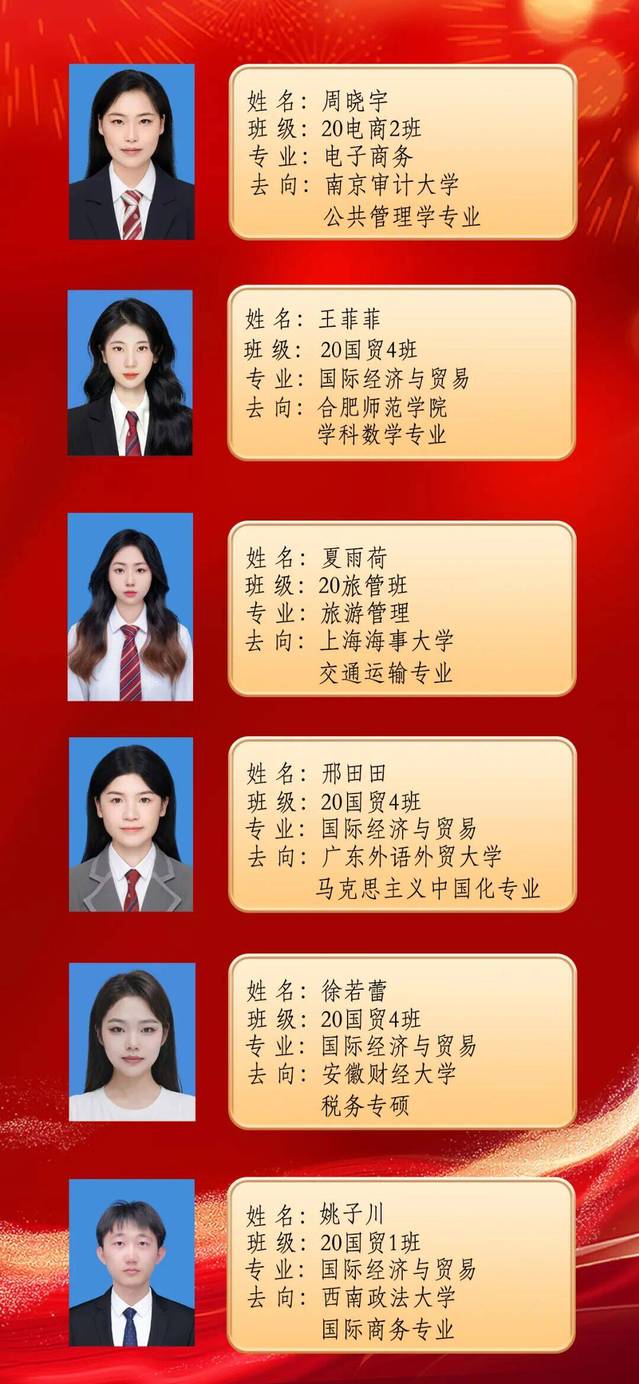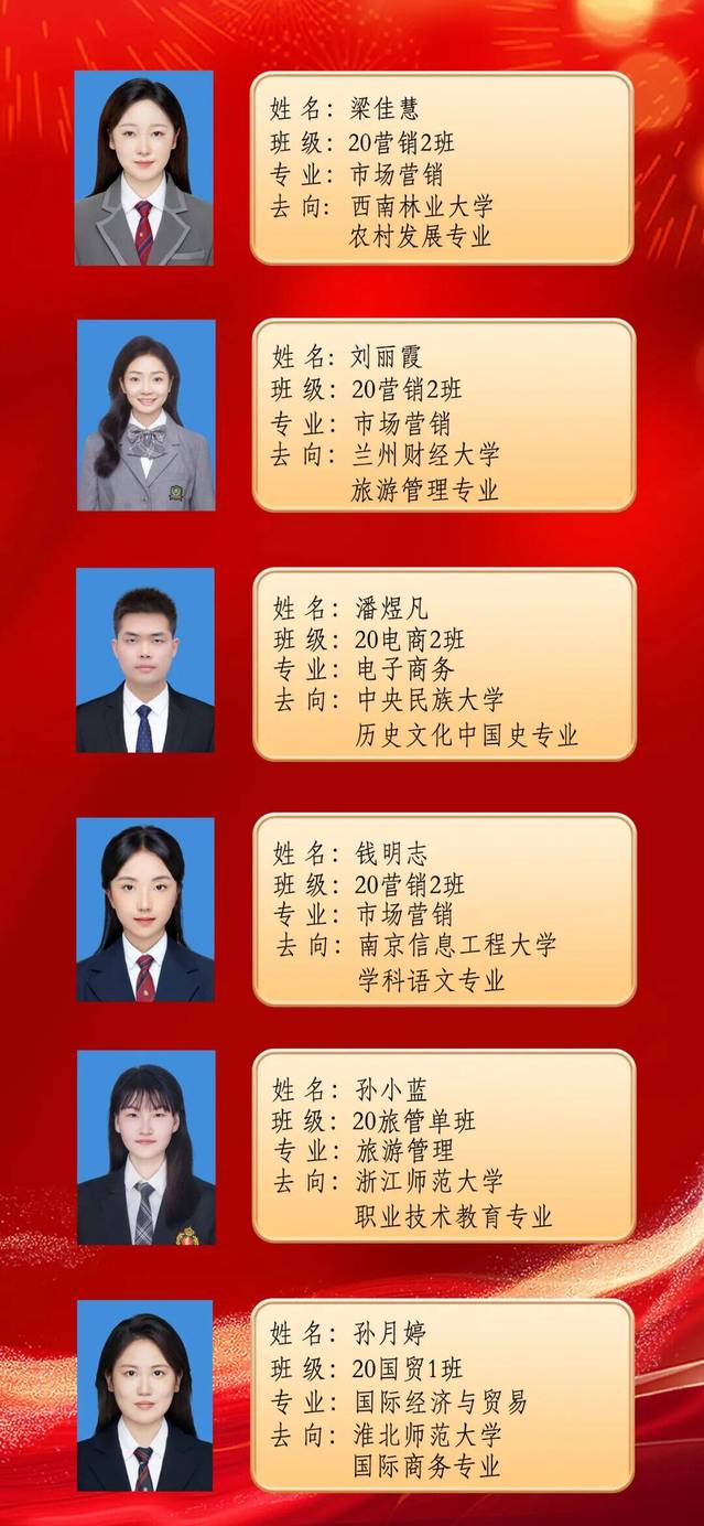 在交流会上,10位考研录取员工首先就围绕如何选取专业和院校、制定复习计划和备考经验、调整复习心态以及复试中的注意事项等共性的问题谈了自己的考研心得和感受,在此基础之上,大家还从自身考研经历,对考研备考中需要注意的时期进行了重点分享。考取南京信息工程大学20国贸3班的张弛特别关注大学期间对专业课程的学习,鼓励大家认真学好专业课程、主动与任课老师沟通;考取西南政法大学20国贸1班的姚子川重点阐述了思想道德与法治方面的复习方法,引导大家借助制作思维导图记忆学习;考取浙江师范大学20旅管班的孙小蓝分享了现行旅游管理培养方案体制下的备考策略,鼓励同学们合理安排时间、循序渐进;考取中南财经政法大学20国贸4班的舒铭则聚焦考研备考心态,详细还原了她从“双非”院校考取“双一流”高校过程中,在面对质疑和挫折时心态的调整;考取淮北师范大学20国贸1班的孙月婷则将目光放在初试后的公司调剂上,鼓励同学们结合自己初试成绩积极寻求调剂,当年能走即走……参与分享会的十位优秀毕业生,以各自的视角诠释着个人的考研备考之旅,赢得了在场同学们的阵阵掌声。整个分享会持续将近两个小时,