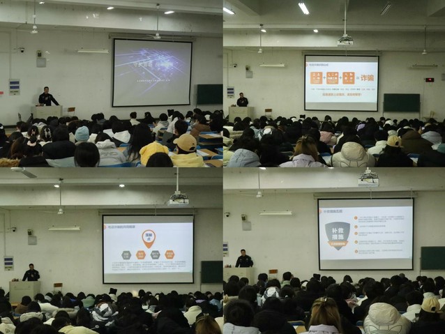 本次安全防电信诈骗讲座主要由“什么是电信诈骗” 、“电信诈骗的常见形式”、“如何识别防范电信诈骗”及“上当后的补救措施”展开。讲座伊始,主讲人以近年来校园内常见的各类诈骗案例为切入点,深入剖析了电信诈骗的构成要件及主要特点,告知同学们要善于识别各类电信诈骗。随后,主讲人详细介绍了当前校园较为多发的网络刷单、裸聊诈骗、冒充亲友、中奖购物诈骗等作案手段,通过生动的案例展示和详细的手法分析,让同学们深刻体会到诈骗的隐蔽性与危害性。吕警官还总结出网络诈骗的共同规律,提醒同学们在日常网络购物、线上支付、收到不明短信或电话时,谨慎操作,冷静应对,及时向周围的同学弄清情况,必要时及时报警。一旦发现个人被骗,要及时立即修改各类支付密码及时止损,通过各种渠道发布信息防止身边的人被诈骗。