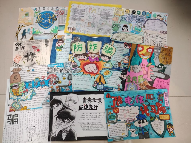 本次活动一经发布,就得到了同学们的热烈反应。同学们展现出极高的热情和创造力,通过网络搜索、查阅书籍、咨询家长等多种途径,广泛收集各类诈骗案例和反诈知识。从常见的网络刷单诈骗、冒充公检法诈骗,到新型的网络游戏账号交易诈骗、虚拟货币投资诈骗等……同学们深入了解各类诈骗手段、详细了解不同手段的防范要点,以绘画、文字的形式,将常见电信诈骗手段化作警示故事描绘在一张张手抄报上。来自不同专业班级的同学们创作出几十余份幅精美的手抄报作品。他们有的运用色彩鲜艳的插画,描绘出日常诈骗手法的狡猾,提醒同学们提高警惕;也有通过漫画的形式,将复杂的诈骗过程以幽默诙谐的方式展现出来,让人在轻松一笑的同时,更加强化了反诈印象。